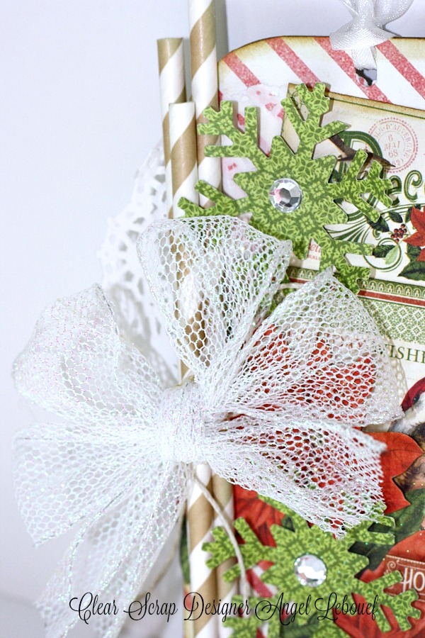 Other Supplies – Graphic 45 and Authentique Paper Collections, Rhinestones, Snowflake Paper Punch, Paper Straws, Mesh Ribbon, Doilies, Ribbon, Glue Gun, Tape Runner, scissors