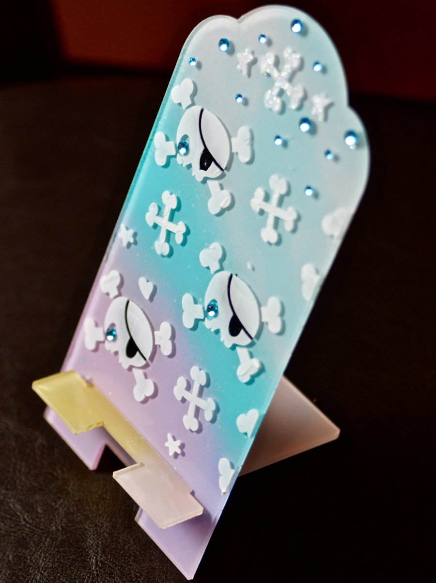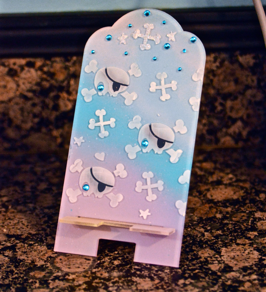 This fun and funky skull phone stand! Most of my friends have phone cases with pink and skulls, why not a phone stand too! I used modeling paste with the Clear Scraps 6" Pirate Skulls Stencil to stencil the front, then used black paint on the back for the eye patch areas, notice I added blue crystals to the other eye for a fun girly effect. Then I graduated Krylon Spray Paint on the back.