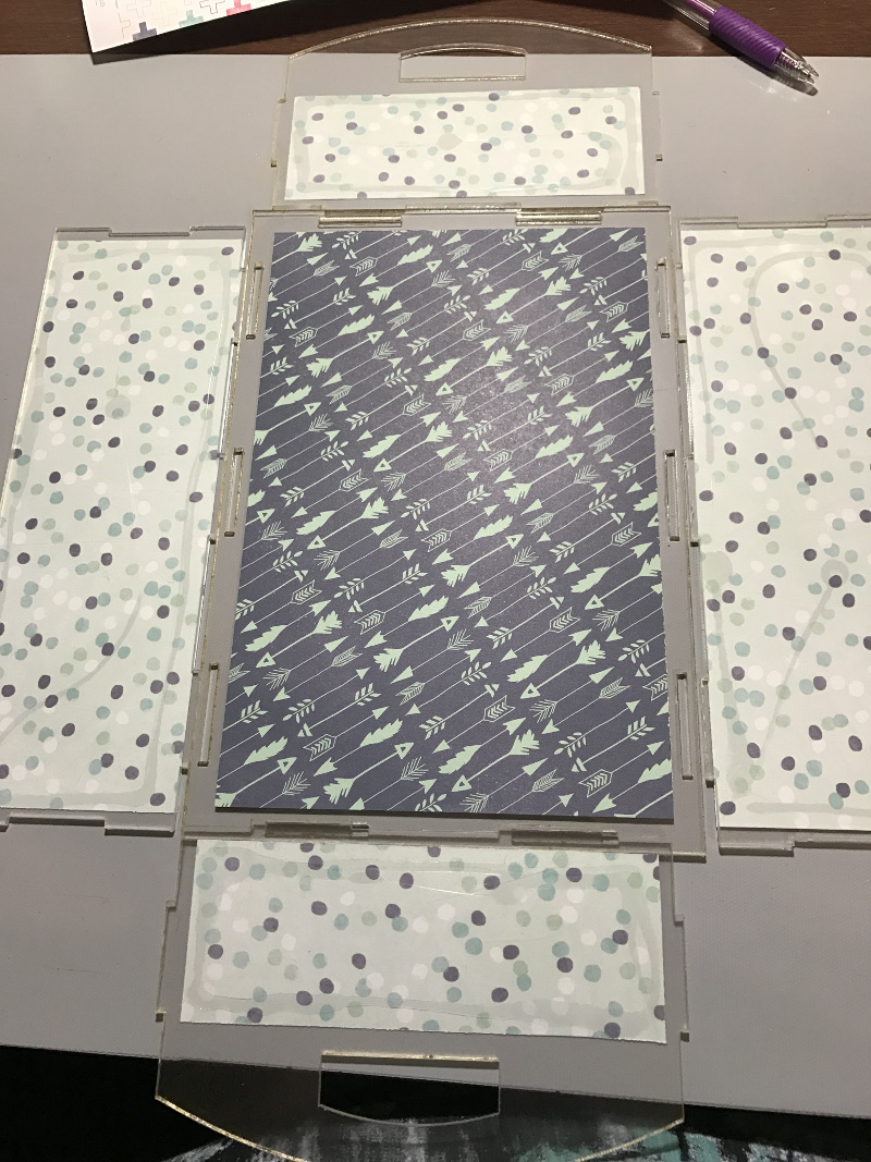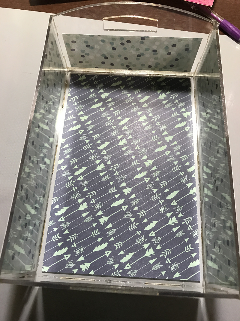 I then cut pattern papers slightly less than the dimensions of the box. I adhered the pattern papers on the outside walls to hide the glue, and made sure to use double sided paper so there would be a design facing inside the box as well.