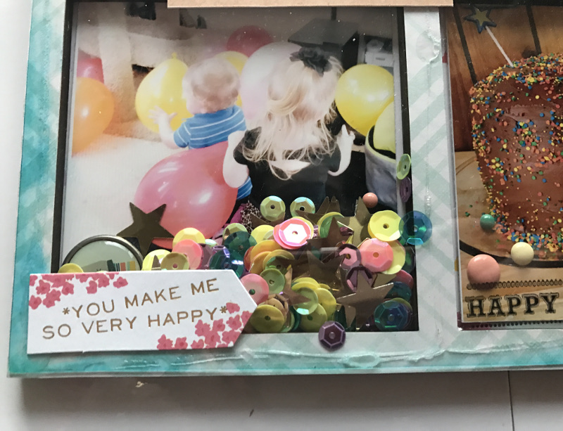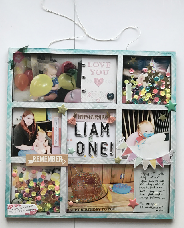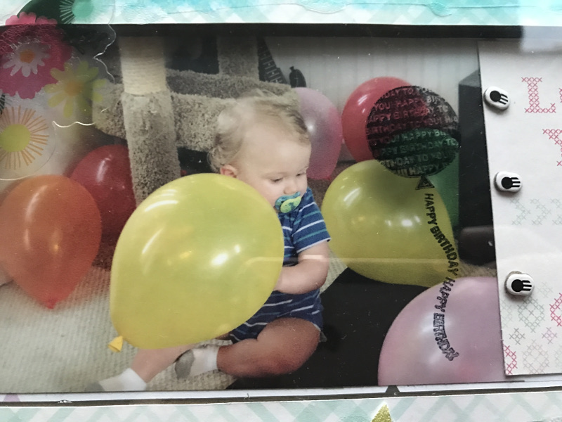 I love how many spots there are for pictures and journaling. I added sequins to two spots on here. It was perfect for this layout of my grandsons first birthday. I adore these photos and had to scrap them again.