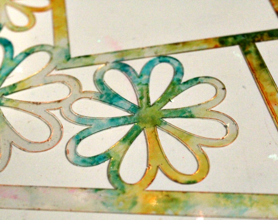 Before adding my photos, I wanted to add some color and sparkle to my acrylic! I used alcohol inks and glitter paint in random spots on the layout allowing colors to mix.