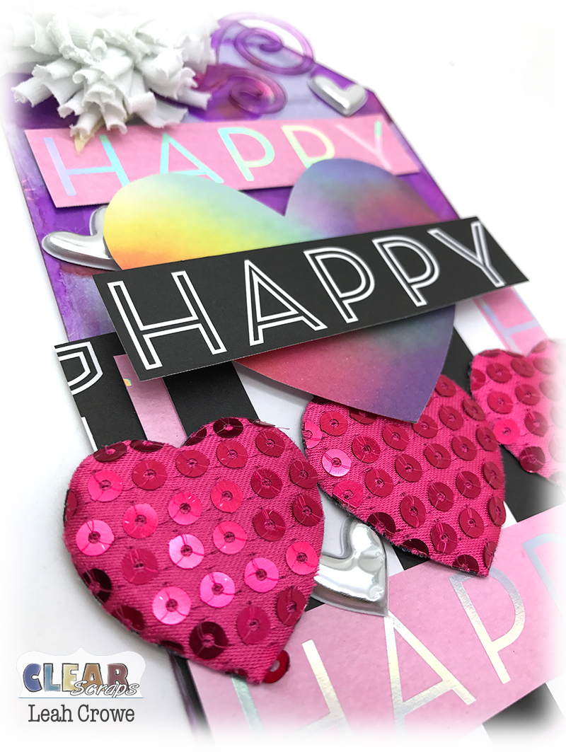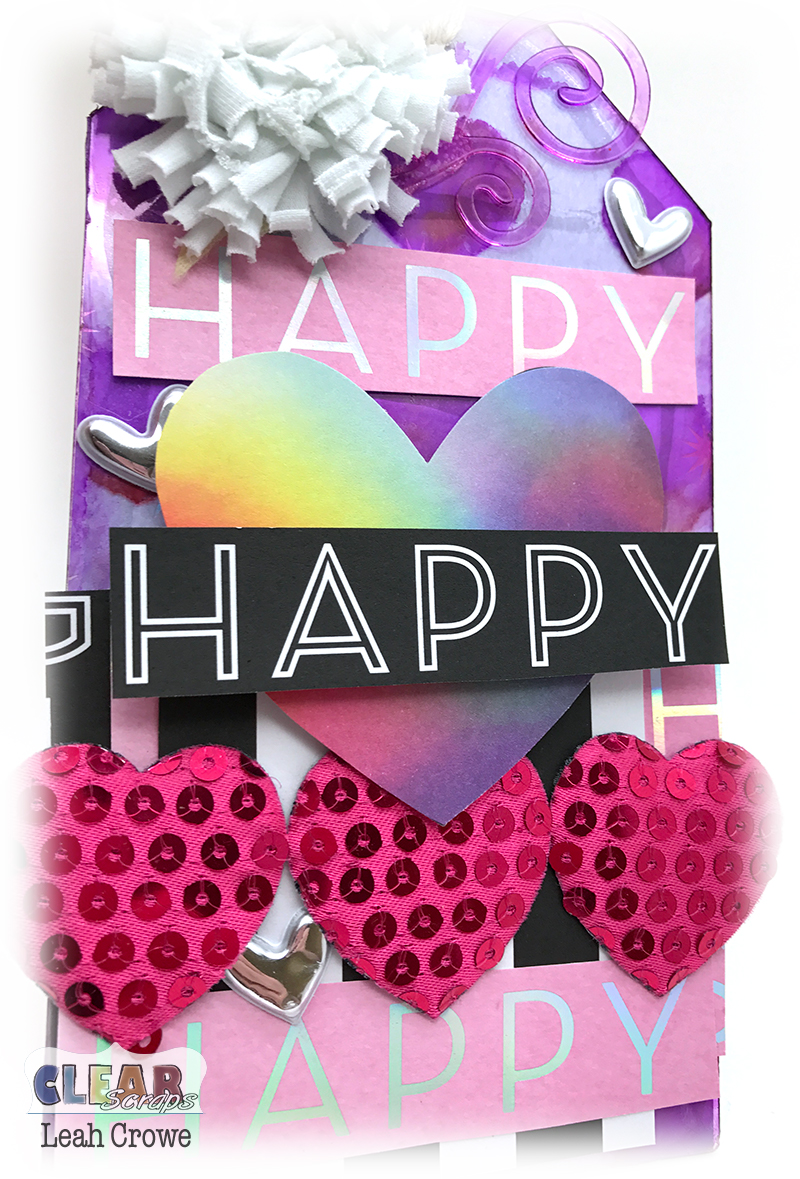 Now, it may be hard to see, and I forgot to take a step by step photo, but for the base of the tag I used the brand spanking New Heart Layer Stencil. I LOVE it! You can kind of see the hearts behind the Clear Scraps Flourish embellishment below.