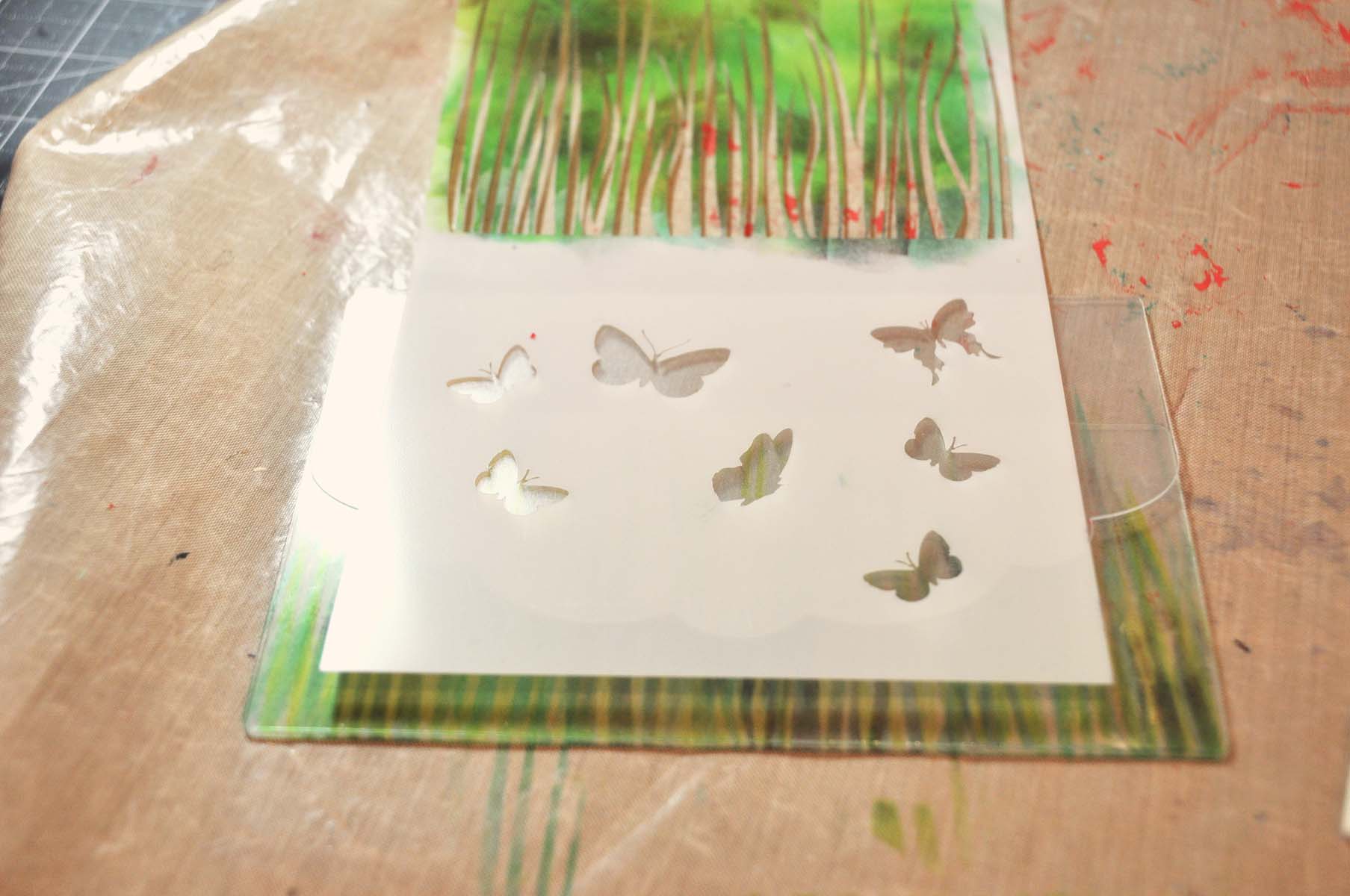 To begin, I inked the grass layer on both the base and bottom layer of the Send it Clear card with a variety of Stazon ink colors. This gave my grass lots of dimension and interest.