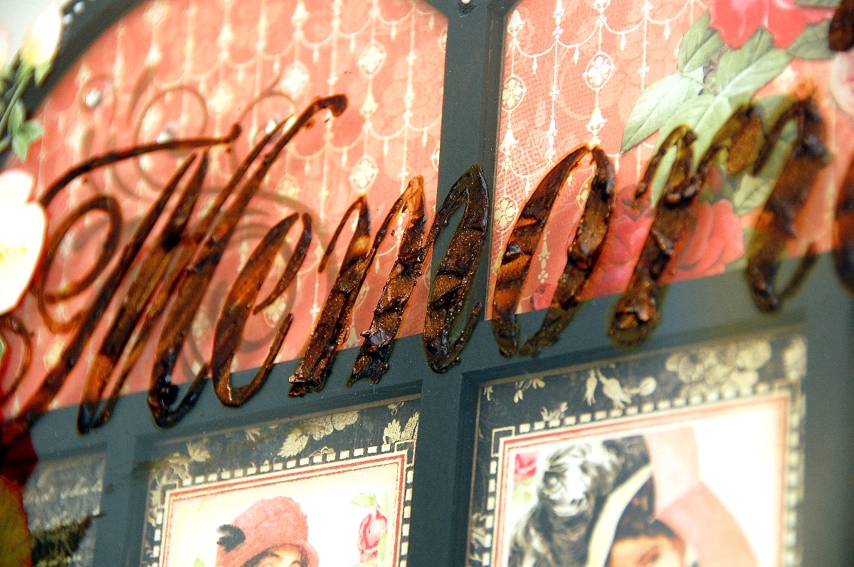 To create some textures and dimension on it, I've used the "Memories" stencil by Clear Scraps and some dimensional paint to create the title for this tray.