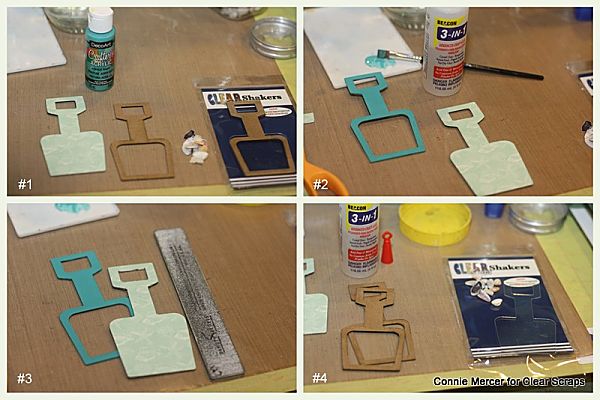 The step out pictures are pretty clear as to how to put the Shovel Shaker together. Cover the back of the shaker with pattern paper, sand edges and glue chipboard frames together.