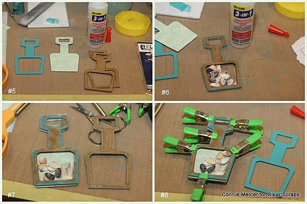 Add the small sea shells or beads inside the shovel and clamp down. Paint the top of the Shovel Shaker frame and adhere over the acrylic frame. Finish decorating the front of the Shovel Shaker.