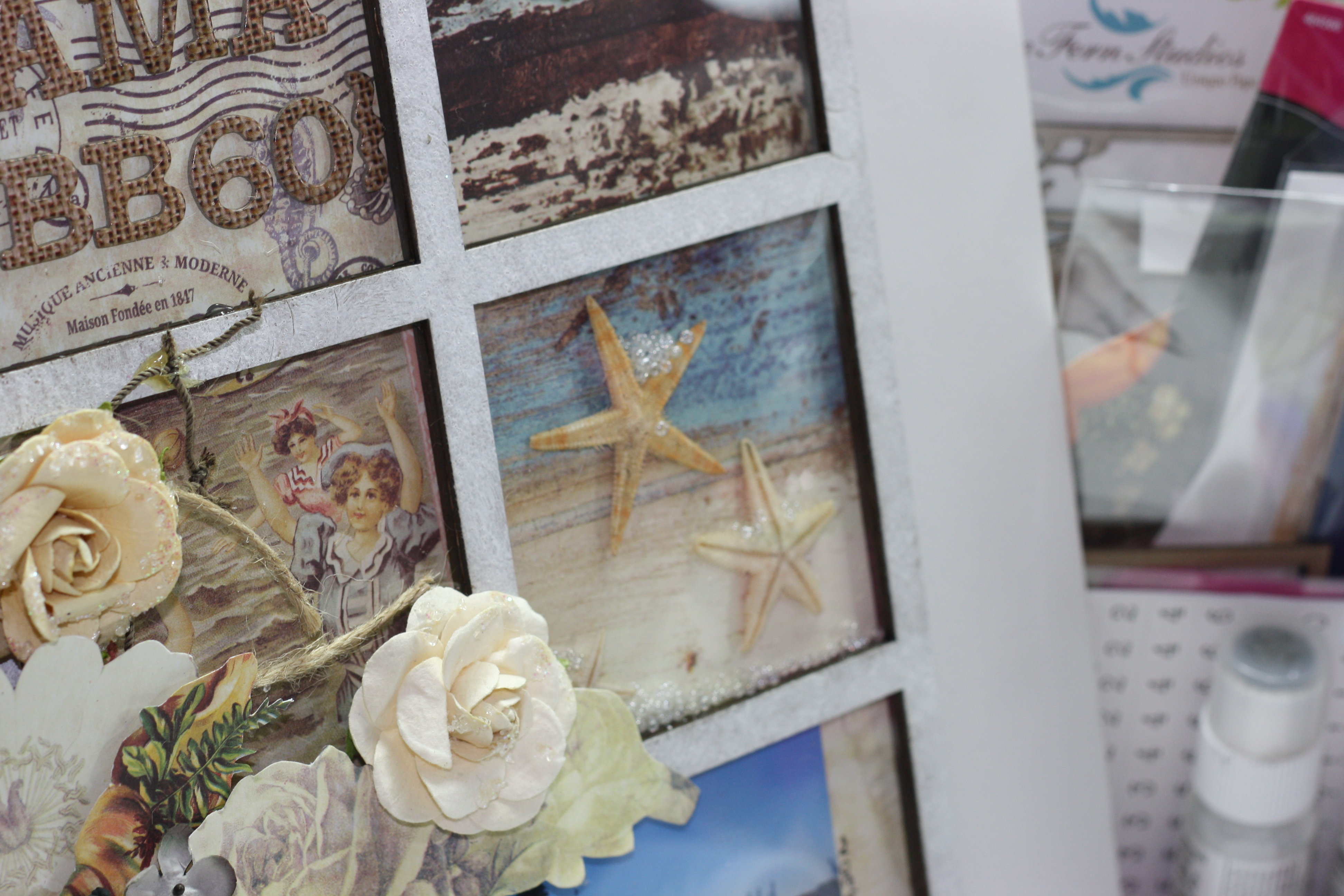 Inside the printer tray i add some starfish and some seed beads to one the the squares. I add the paper pieces where I wanted them along with the photos and title.
