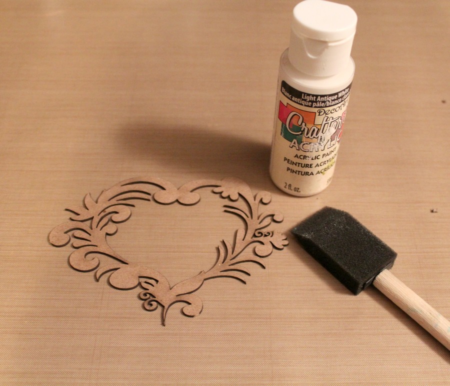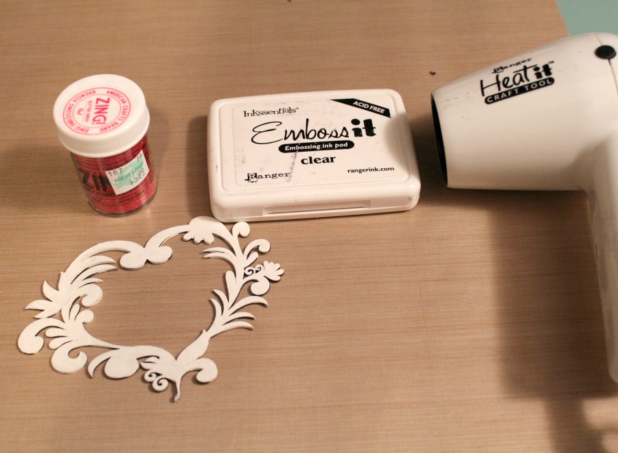 While allowing my tag to dry, I painted the Flourish Heart Chipboard Embellishment with white acrylic paint.