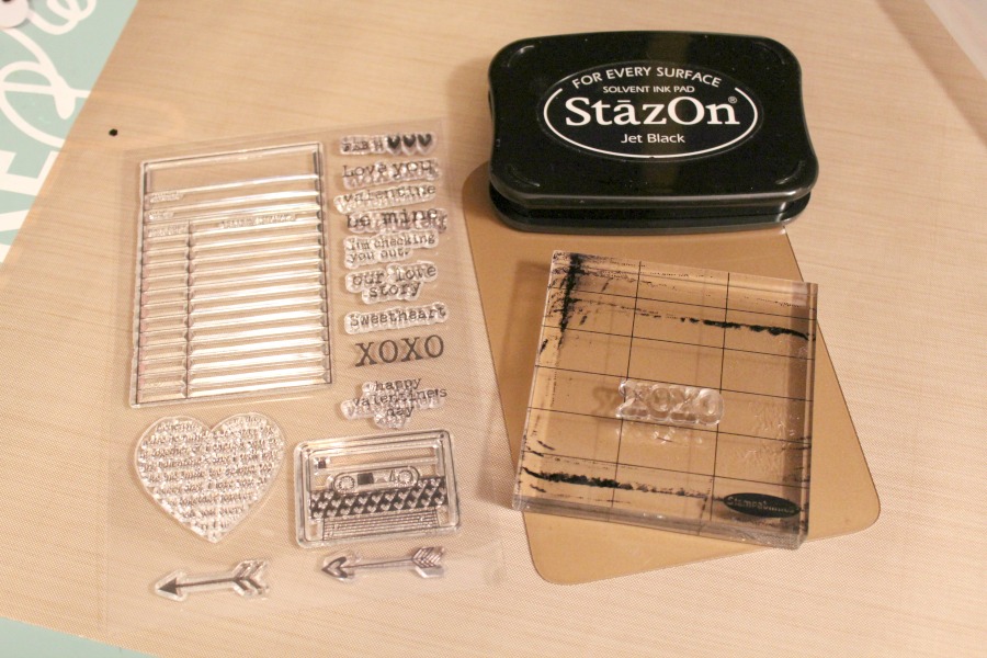 Before adding my papers and embellishment to my tag, I wanted to add a background. At first I thought about using modeling paste but then remembered that I had the coordinating stamp set to the paper line I was using! StazOn inks are highly recommended to use on acrylic because they are fast drying. I used my black StazOn with two of the sentiments and did some random stamping on my tag (opposite of what side I applied my paint).