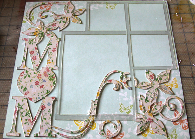 I simply adhered my patterned paper to the back of the acrylic (be sure to remove the film first) then trimmed around the flowers, frame and flourishes.
