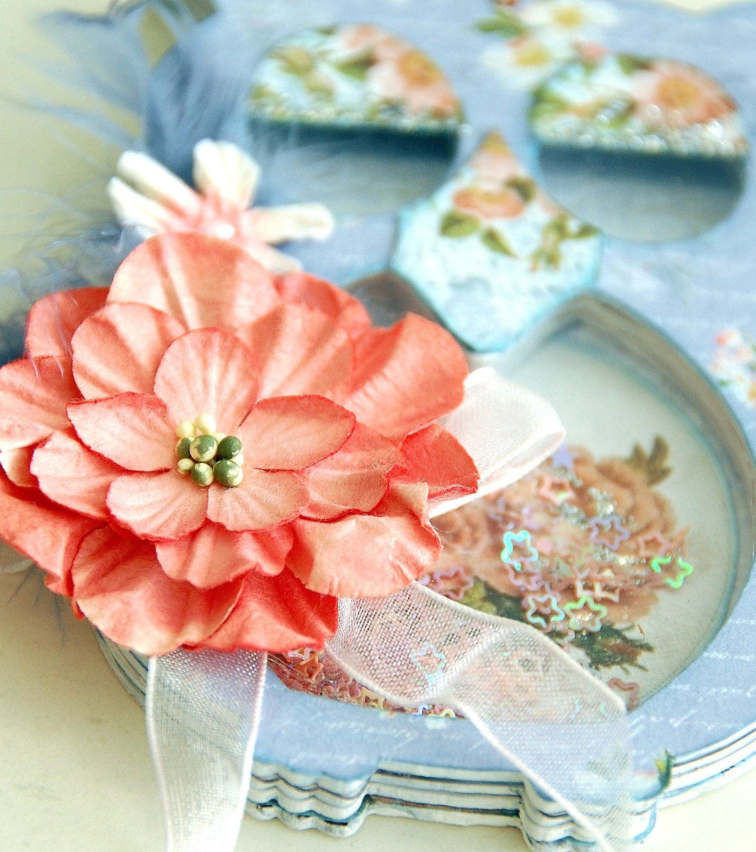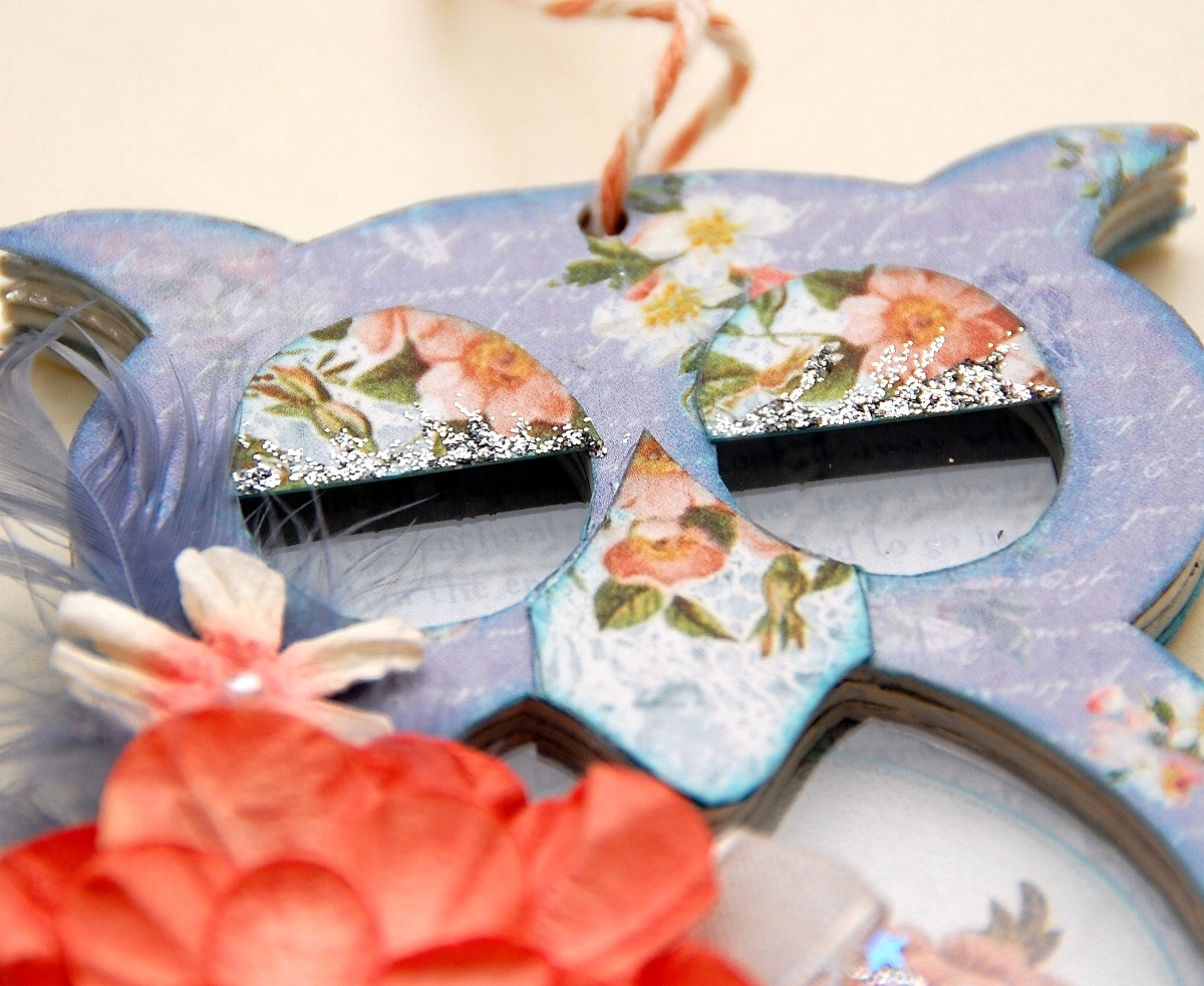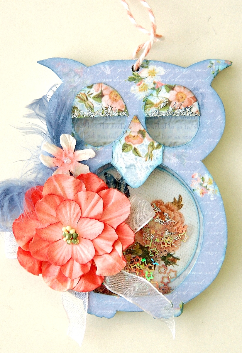 I've used tons of pattern papers to decorate this owl shaker. To further detail it, I've used some glitter paste, some flowers, ribbon, feathers and tons of sequins.