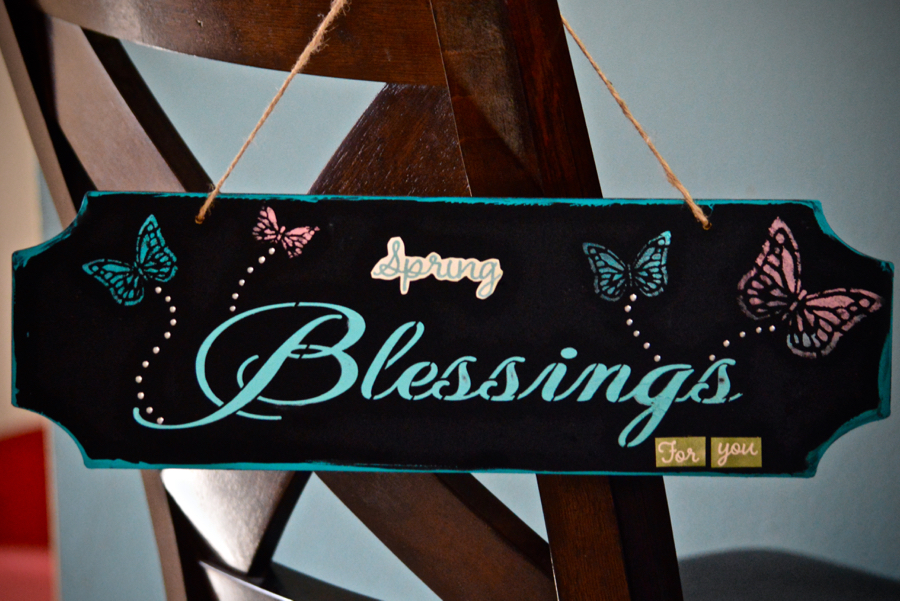 For this project I had an old chalkboard I had use for some photography I did, and it was just laying there so I decided it was the perfect frame to use the NEW Blessings 3X12 stencil/template for some home decor. So I mixed some paint with good old Gesso, and created a soft robin egg blue, then I stenciled it onto the middle of the chalkboard.