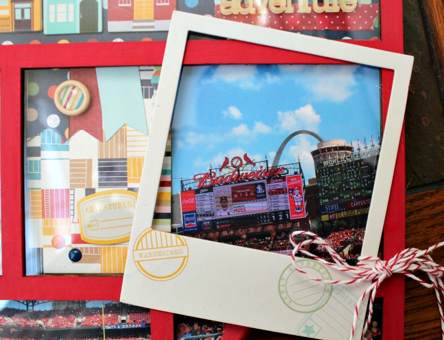 Once I adhered my top chipboard frame, I added a cute insta-frame embellishments over the top. I also used a bit of bakers twine to accent.