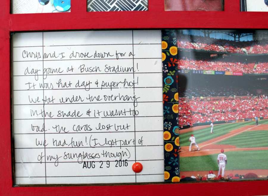 The wider slots can hold larger photos or you can use strips of paper/chipboard to "break" them up. I used both a photo and a journaling spot on the bottom left.