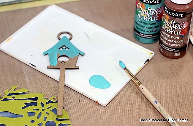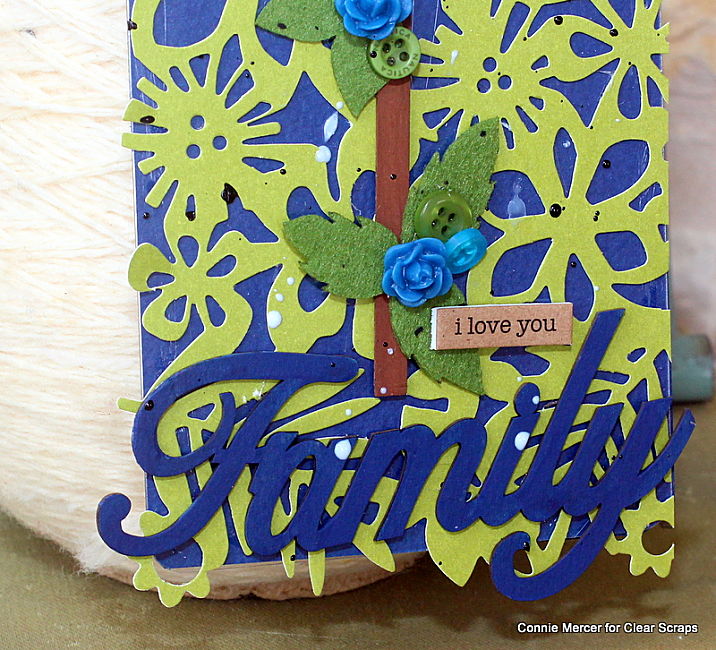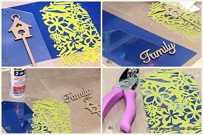 Hi, Connie here with my March Tag tutorial using an acrylic tag by Clear Scraps and one of the new chipboard embellishments! Using one of the chipboard bird houses it was fun to create a tag with family in mind. Let me show you~