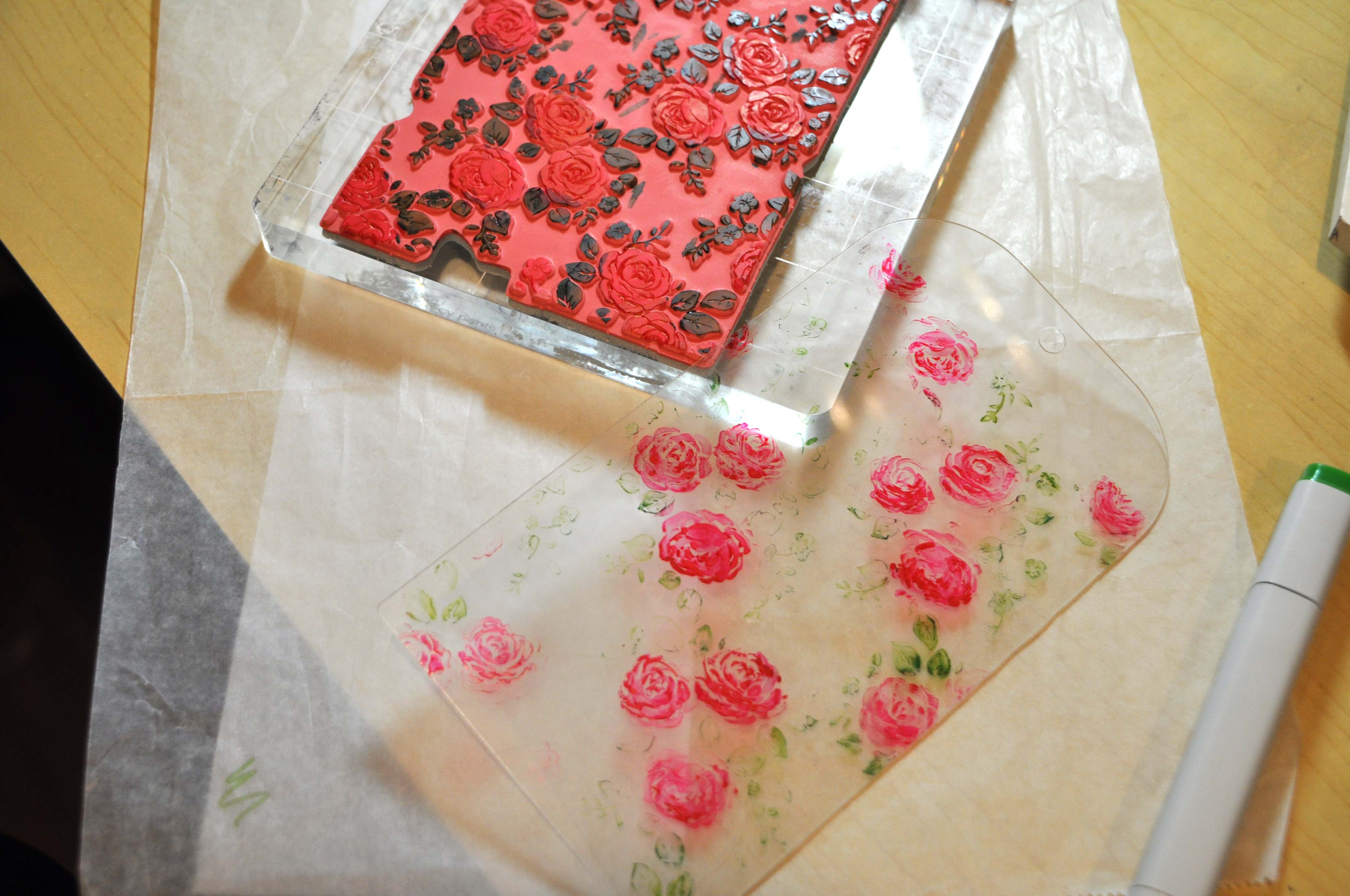 I began with one of the Clear Scraps Acrylic Tags from the Tag Album which I stamped on using alcohol markers. This was a two step process, first I stamped the roses, then the vines.
