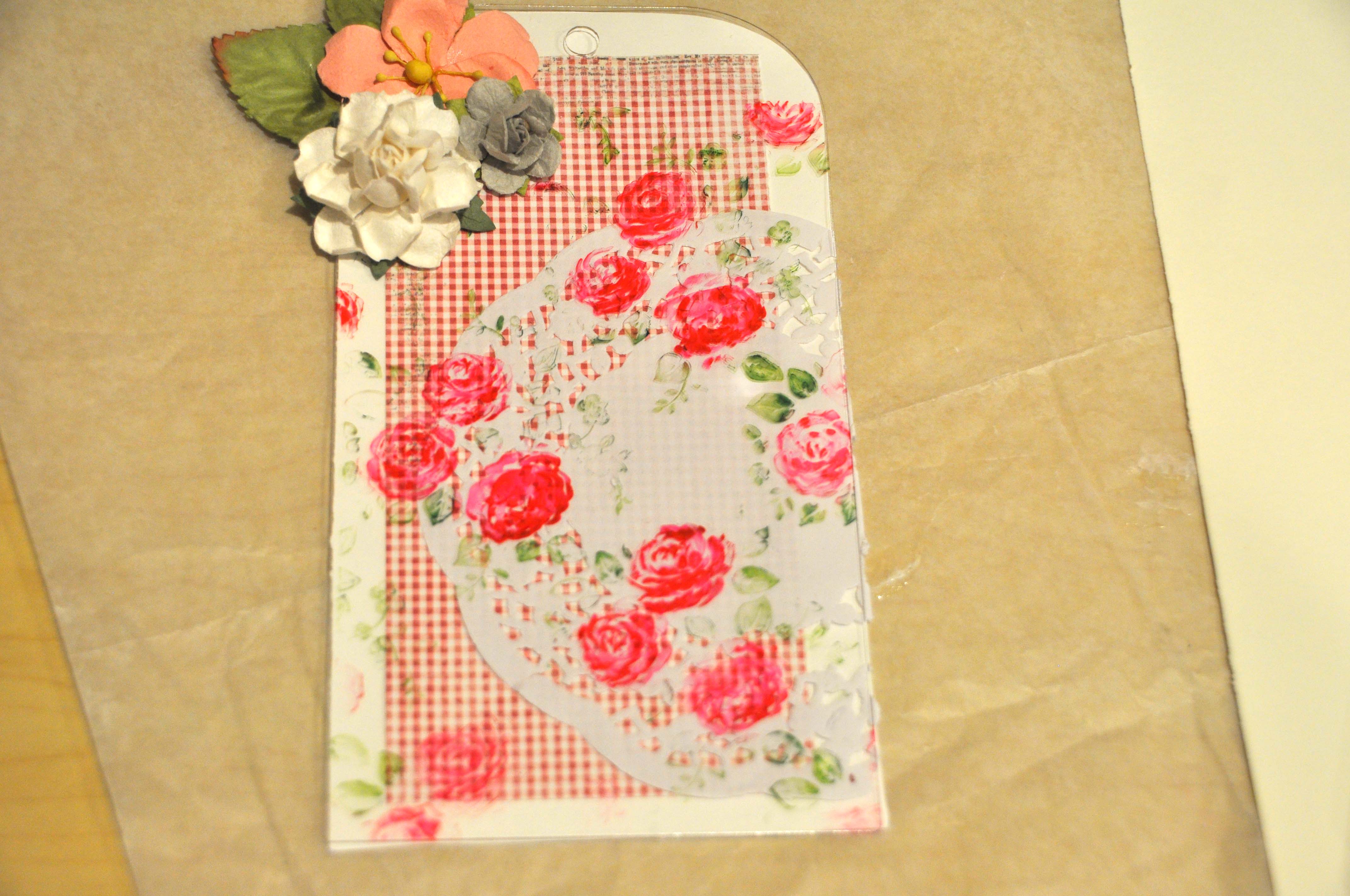 I then layered a piece of cardstock that was cut to size, a sheet of patterned paper and finally a doily and attached them to the back of my tag with a bit of Zip Dry.