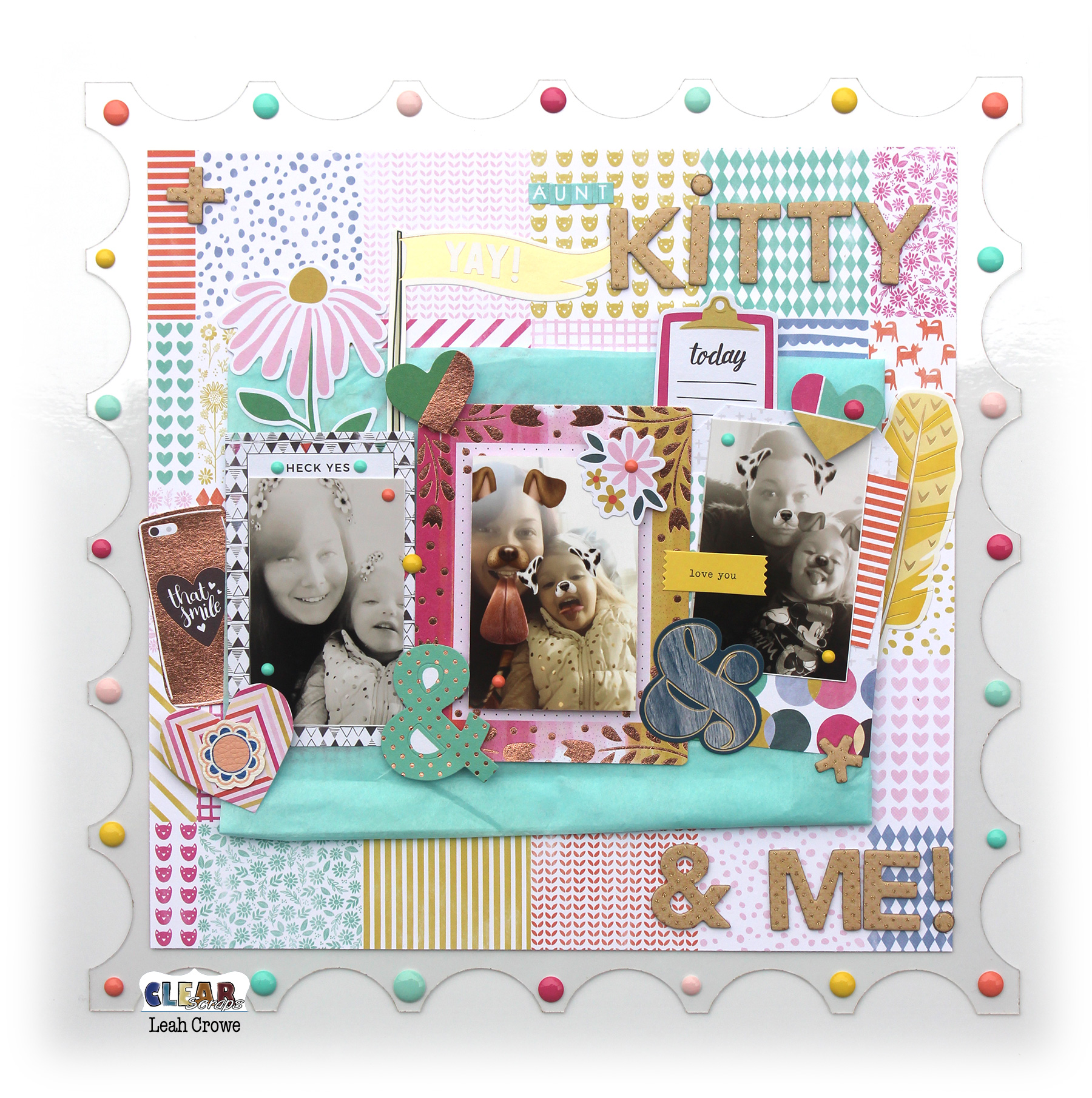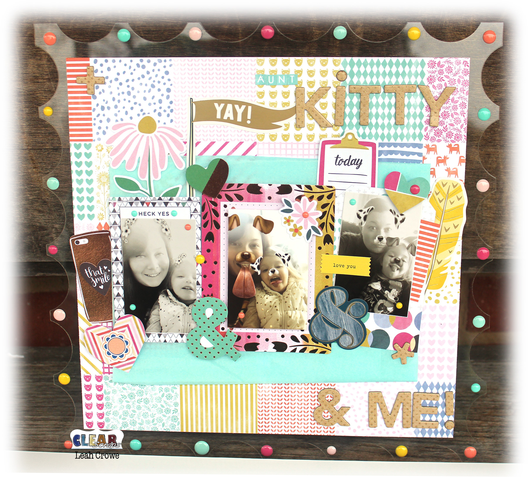 Today, I am sharing my take on the XL Dazed Acrylic shape layout. Recently my grandchildren have come to live with me, and we have lots of great photo opportunities with their Aunts and Uncles. The selfies are in abundance and make me so happy to capture them in layouts.