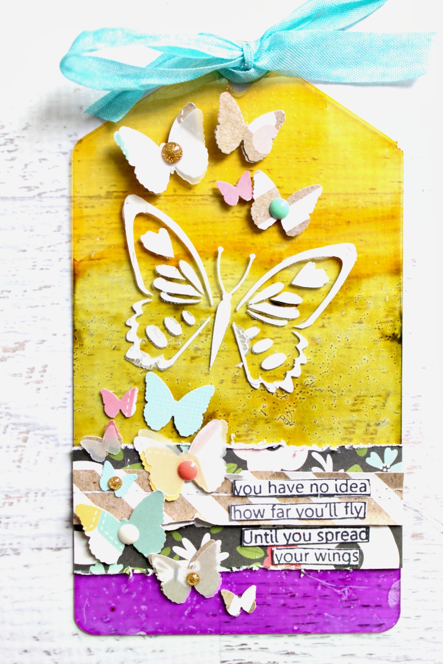 I allowed the alcohol ink to dry and flipped over my tag. Next, using the 6 Inch Swallowtail Butterfly Mascil and modeling paste, I applied one of the butterflies.