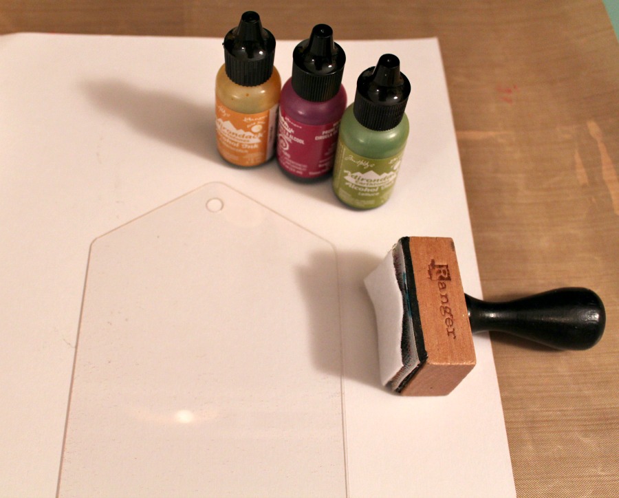 I started with my Acrylic Tag and three alcohol inks that are color coordinated.