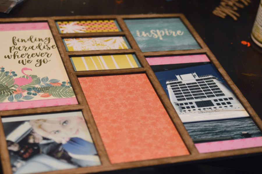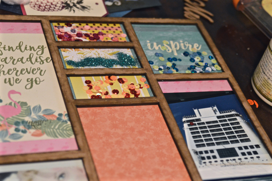 I trimmed out the pattered paper and adhered each piece into place on the bottom solid chipboard piece, there is a total of 5 layers, the solid bottom chipboard piece, 2 chipboard "window frame" layers (to place sequins or glitter/buttons etc…), then an acrylic layer, then one more chipboard cover "window frame" piece.