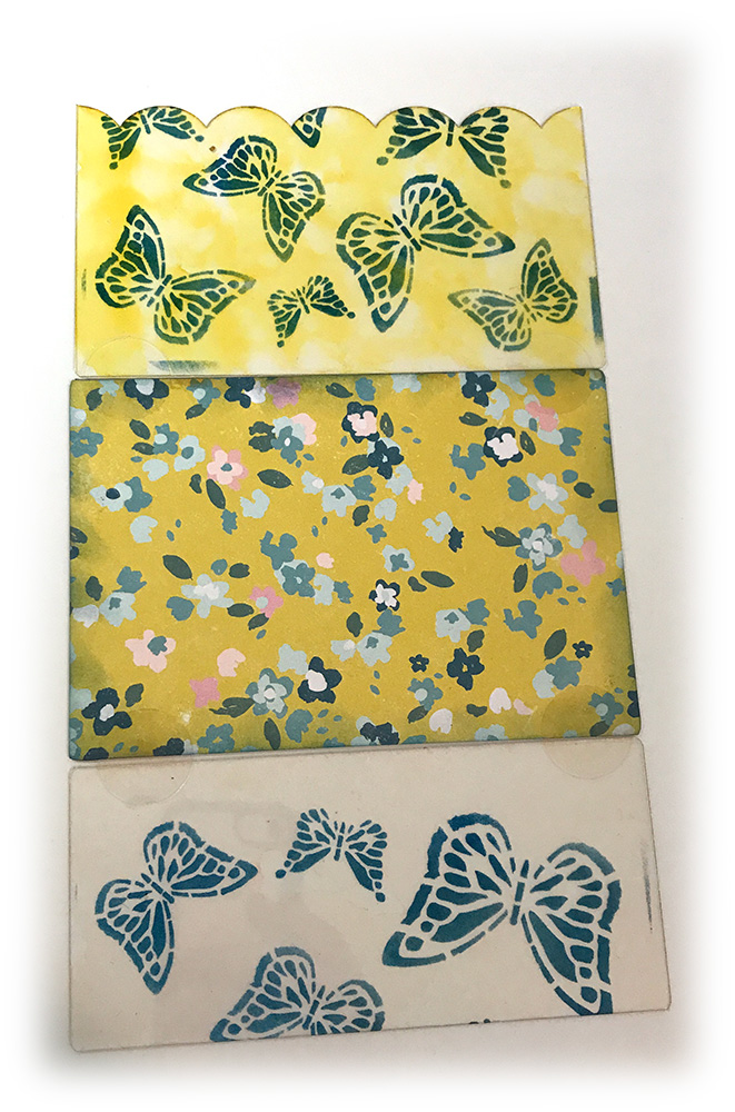 I then peeled the film off the backside of these panels, coloring the top panel (scallop side) with yellow alcohol ink, and the bottom panel with salmon.