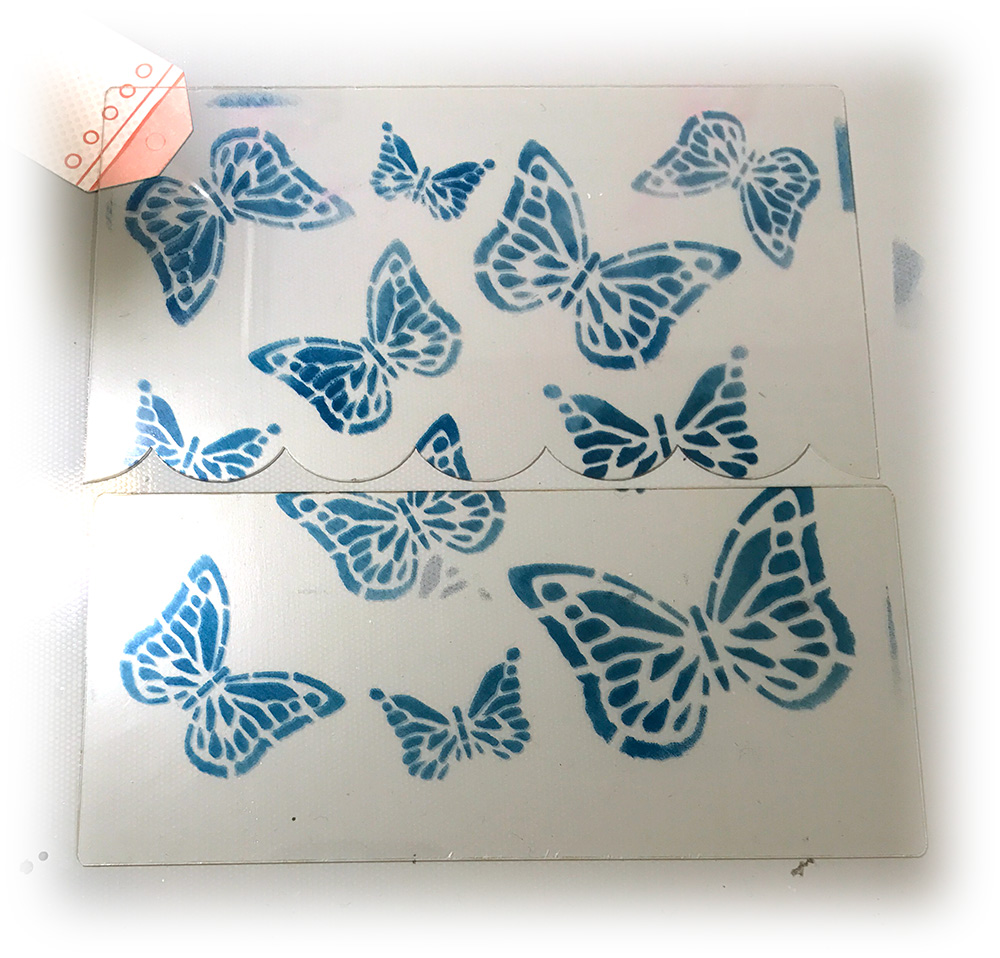 I started off by taping down both front panels of the card, then stenciling the 6" Monarch Butterfly stencil pattern using Stazon ink.