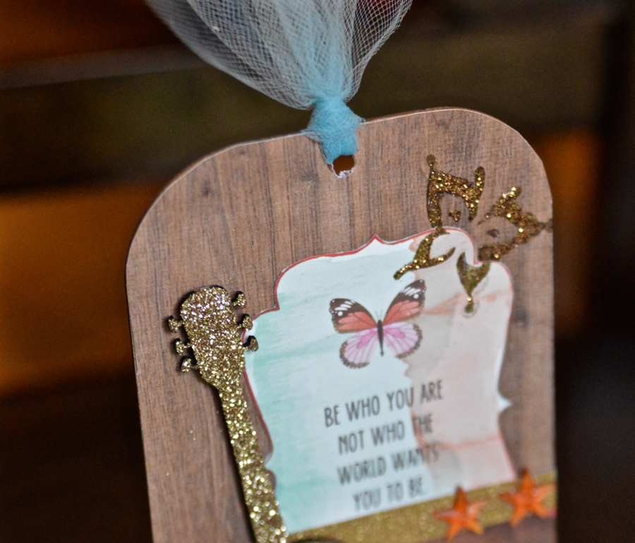I covered the Chipboard Tag Album Page using the Creating Made Easy May Kit patterned paper (PhotoPlay) then took the Guitar Chipboard Embellishment (also included in the kit) and sprayed it with adhesive and coated it in GOLD glitter!