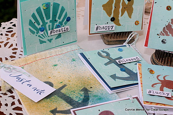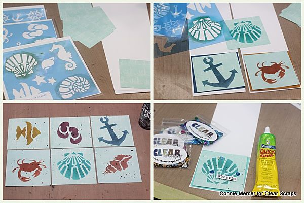 The cards are 4"X 4". There are 6 cards in the set. Each card is stenciled with a nautical image from the Ocean Friends and Beach Fun stencils by Clear Scraps. I used different color of inks for a fun look. Each card is decorated with Sequins by Clear Scraps. See steps taken in photo below.