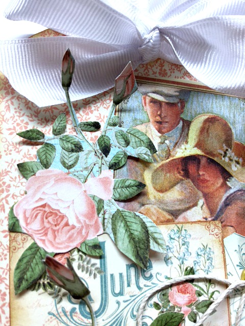 As you can see I fussy cut the roses multiple times to place and tuck around on the top of the tag. Layering till you get the look you one by stacking and tucking behind other cutouts.
