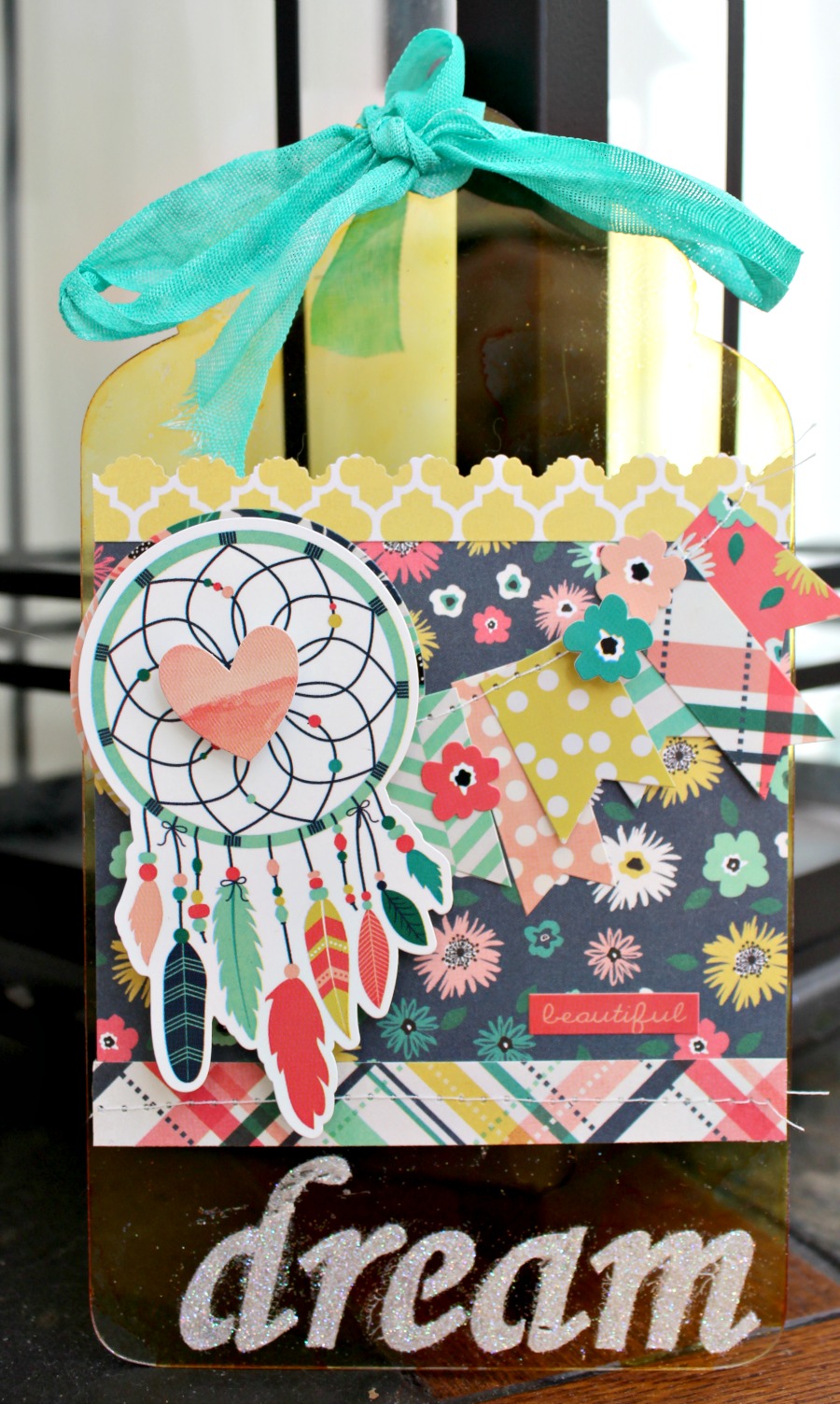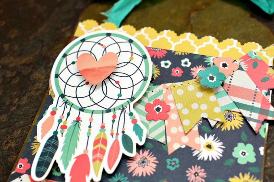 Once my word was dry, I added patterned papers from the collection as well as stickers. I love pennants and created a banner with some of the coordinating stickers! I also used foam tape to pop up my dream catcher to give some dimension to my tag! Lastly, using some spray ink I colored my ribbon to match my paper and tied to the top once dry!