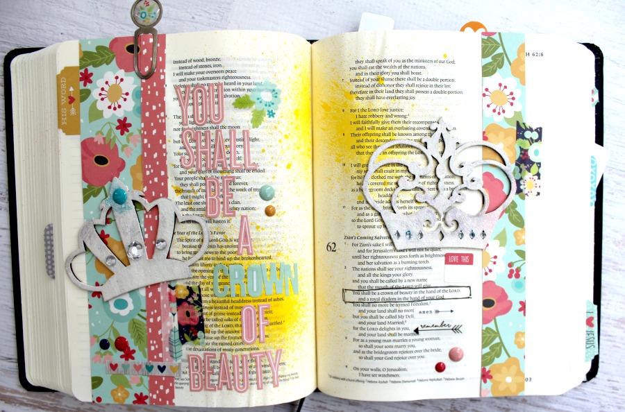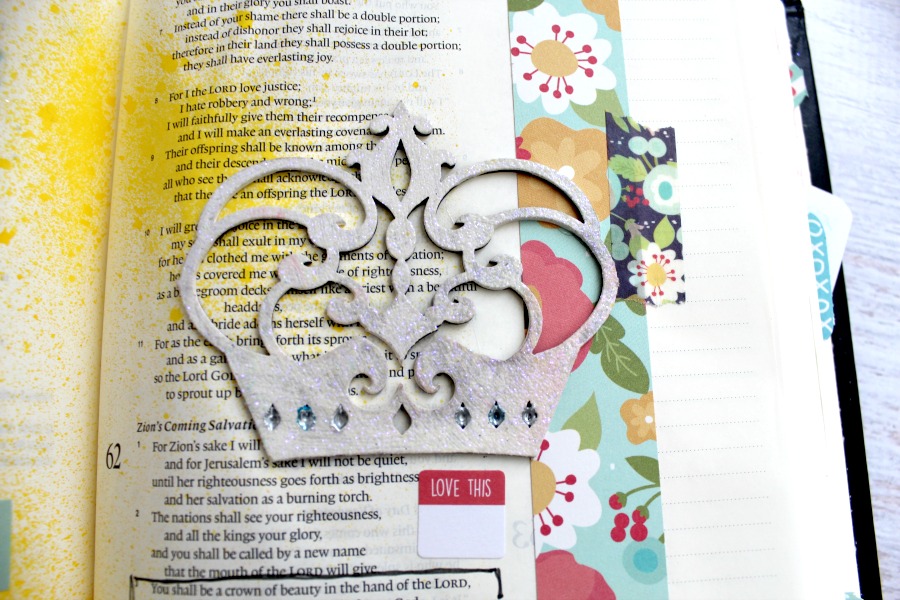 For my first pages, I used the Crown Chipboard Embellishments that are perfect for my scripture! The Chipboard Embellishments are light enough that they won't make your layouts too heavy. I lightly sprayed my pages with yellow spray ink followed by adding strips of patterned paper and washi tape. After placing my letter stickers, I was ready to add my embellishments!