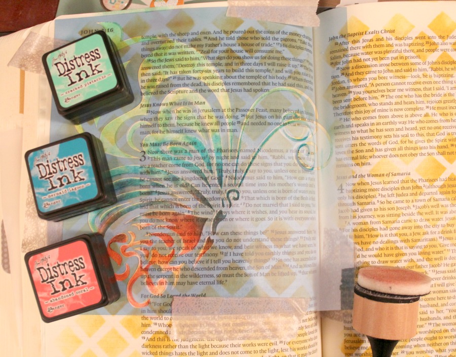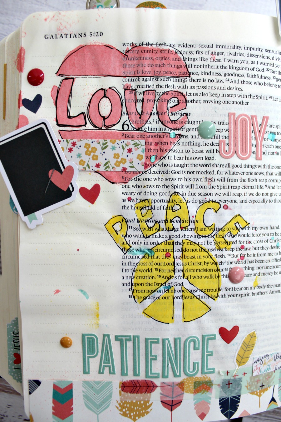 For my last spread, I used the 3×12 Truth, Peace, Love Mascil to document the Fruits of the Spirit! I used pink and yellow spray inks with my Mascil and outlined with a black journaling pen.