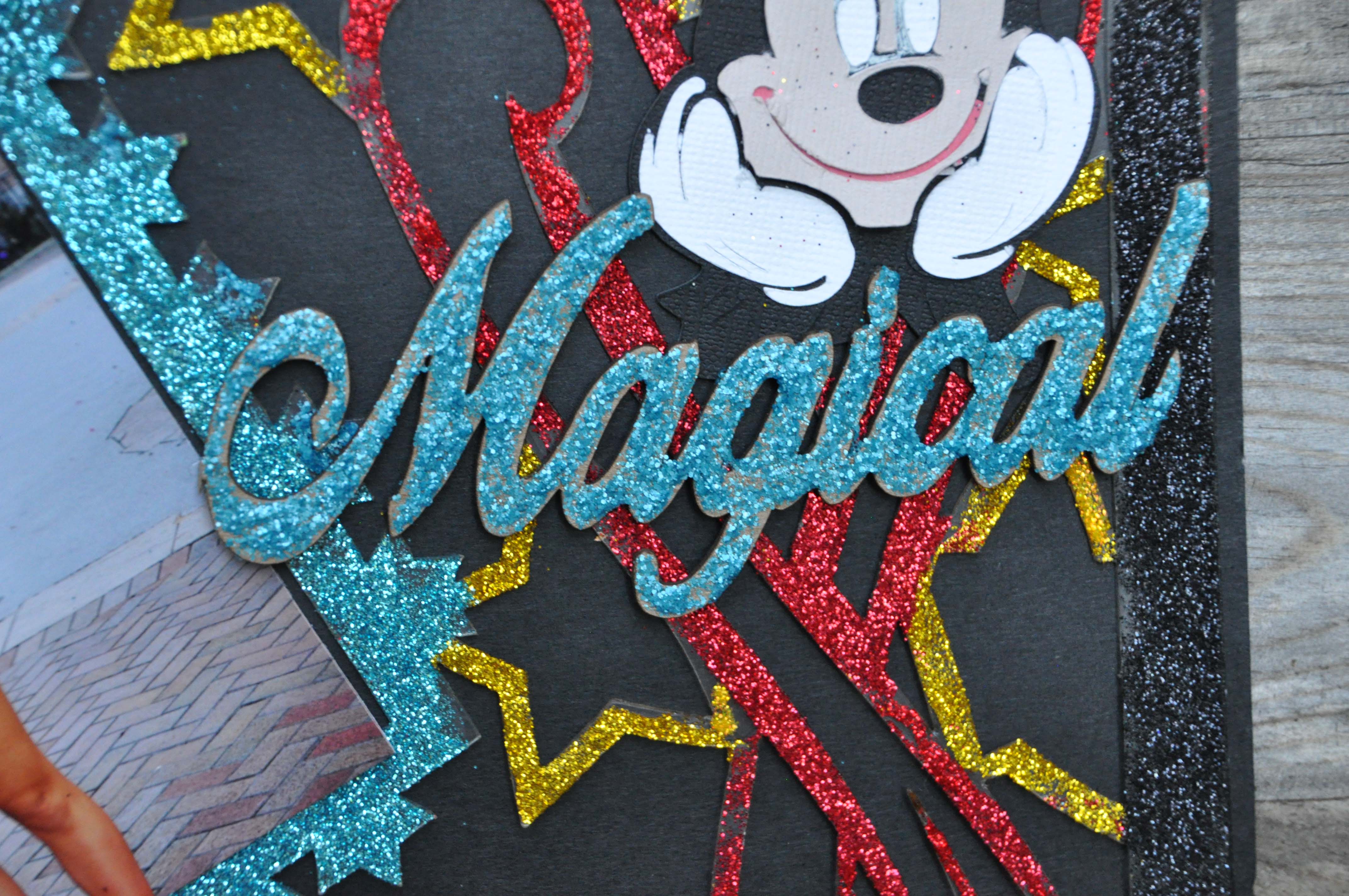 I used the Magical Chipboard Word Title (also covered in glitter…I'm all about the theme.) Glitter and acrylic don't always stick together, so be sure and seal the glitter before you move on.
