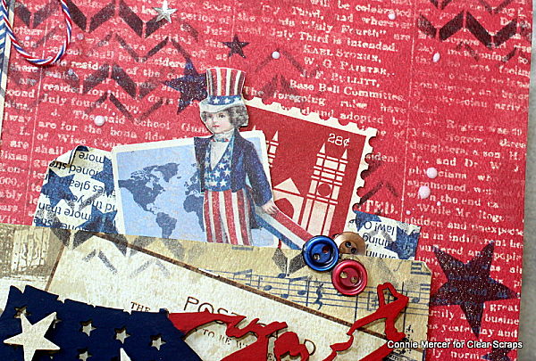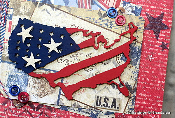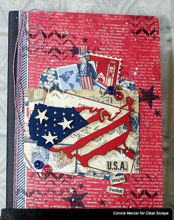 Hi, Connie here with a patriotic journal using the USA chipboard piece by Clear Scraps. Clear Scraps makes many shapes and designs in chipboard and this one is a favorite of mine. I wanted to create something really special with it. Something you would want to keep, so a journal was created showcasing the USA chipboard. Take a look~