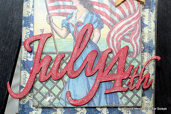 Hi, Connie here with my July tag with Clear Scraps. I used a couple of the chipboard embellishments, along with an acrylic tag, to create a festive 4th of July tag.