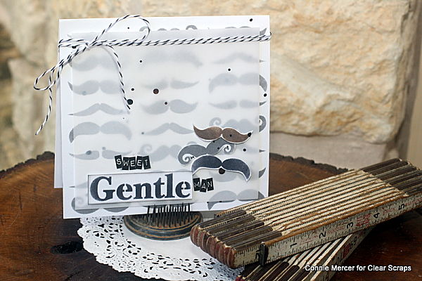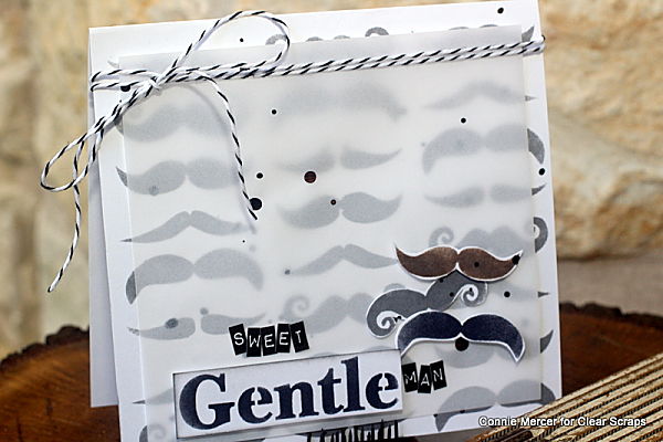 I loved the 6" Mustaches stencil by Clear Scraps. It makes a really cute background for a card. On this card I used some of the mustaches for the larger images. The word "Gentle" is on the 6" Fruit of the Spirit" stencil and was perfect for this card. Follow the same steps, as listed above, to create this card.