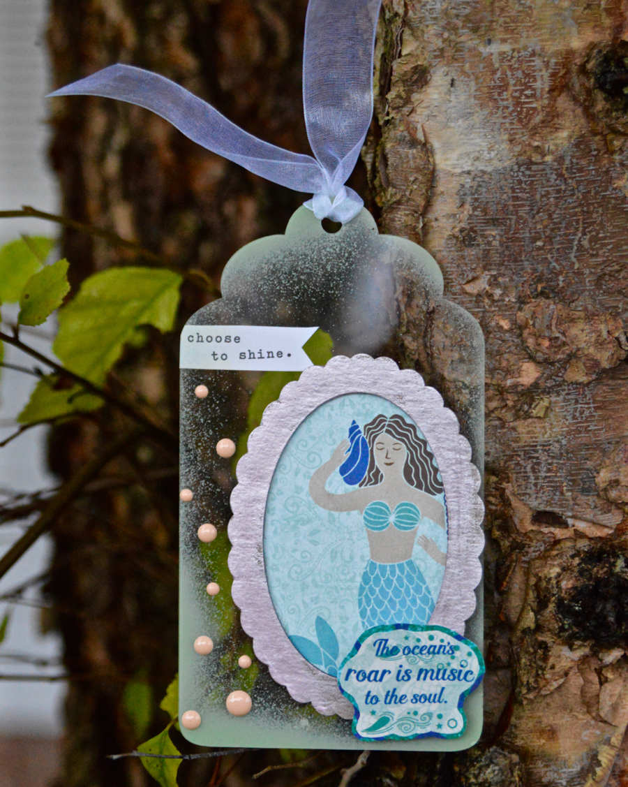 Then I cut out the "The Ocean Roar is Music to the Soul" and placed it on patterned paper then popped it up on the frame and adhered it to the tag.