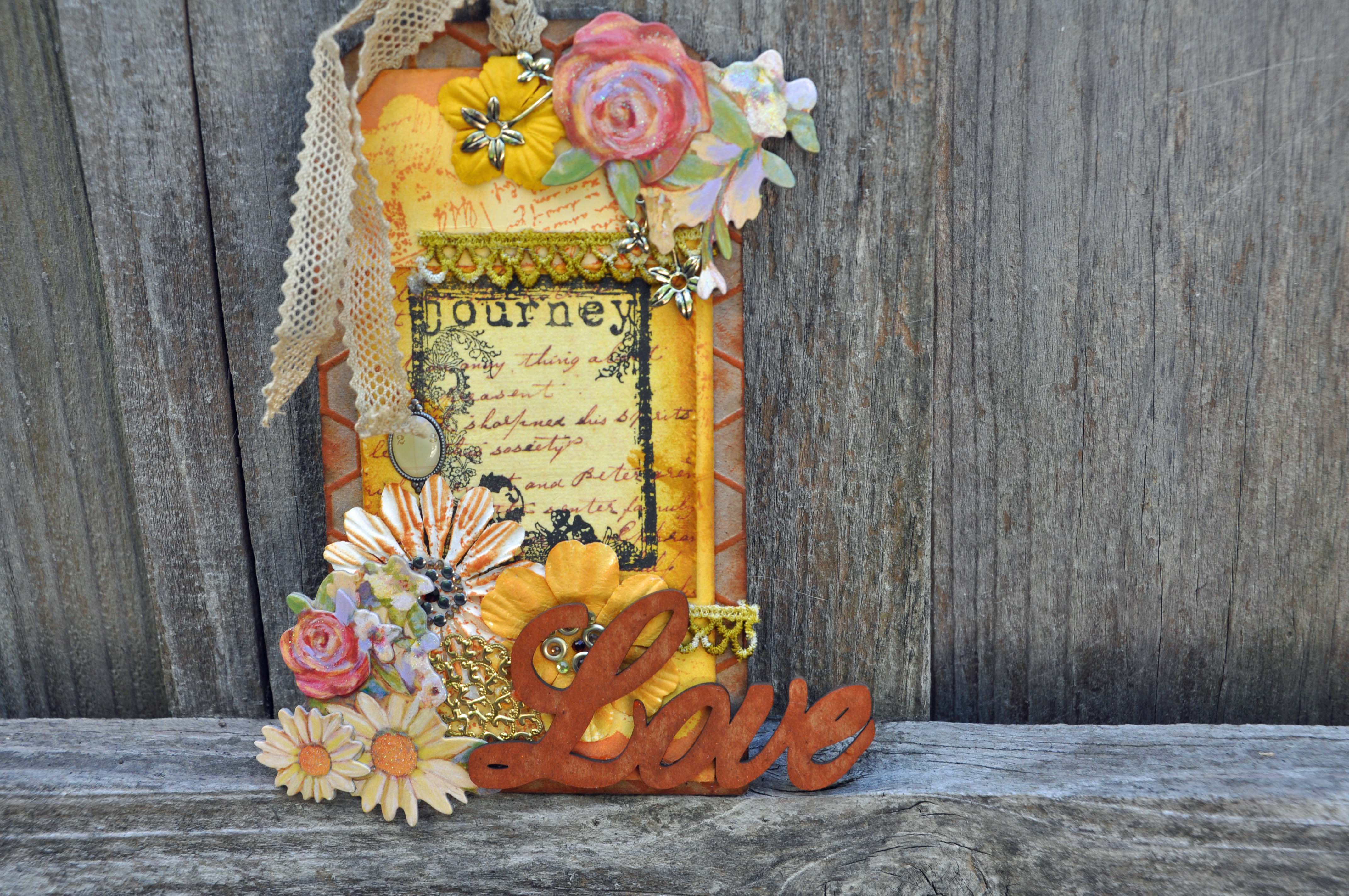 I then covered my embossed chipboard tag with bits of trim, metal findings, flowers and chipboards, including the beautiful Love Word Title.