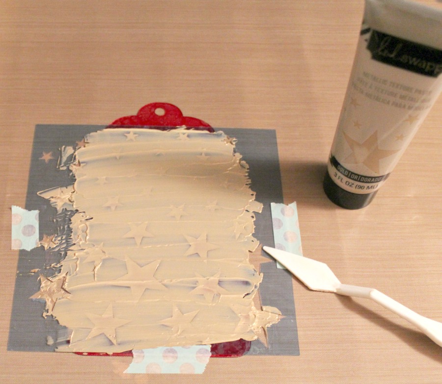Once my alcohol ink was dry, I flipped over my tag to add my background using the 6 Inch Stars Mascil and gold metallic texture paste. I applied a thick coat of texture paste to ensure coverage; it even helps to use your index finger to smooth out any lines!