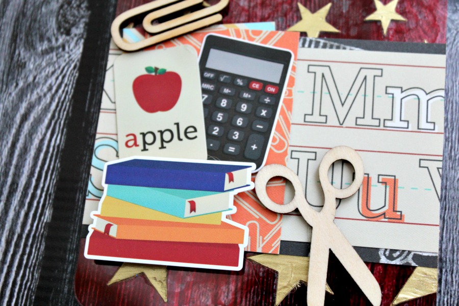 I then added patterned paper and embellishments as well as cute ribbon to finish! This would be cute as an accent on a teacher gift or on the front of a school album!