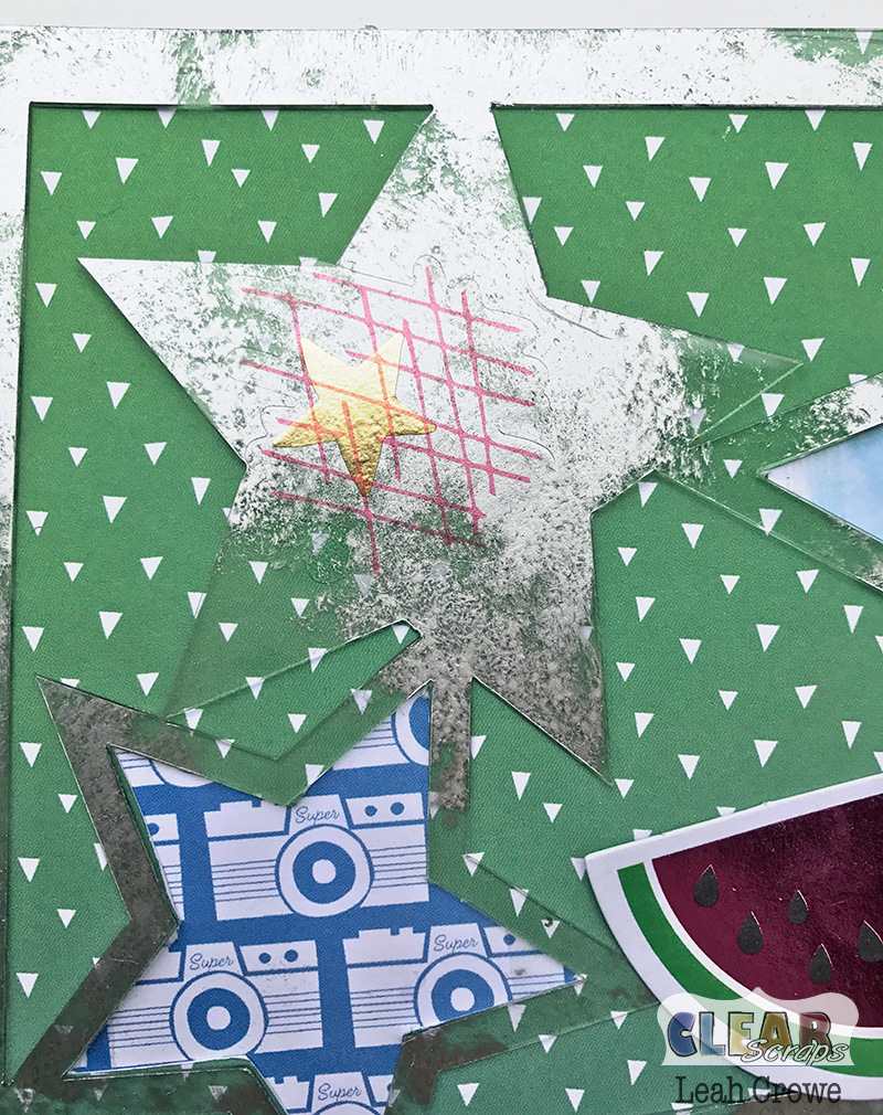 Once that dried, I adhered the layout to pattern paper using Beacons 3-in-1 glue. Once that dried, I used my Kraft knife to cut away some of the stars and then adhered pattern paper behind the stars on the backside of the layout.