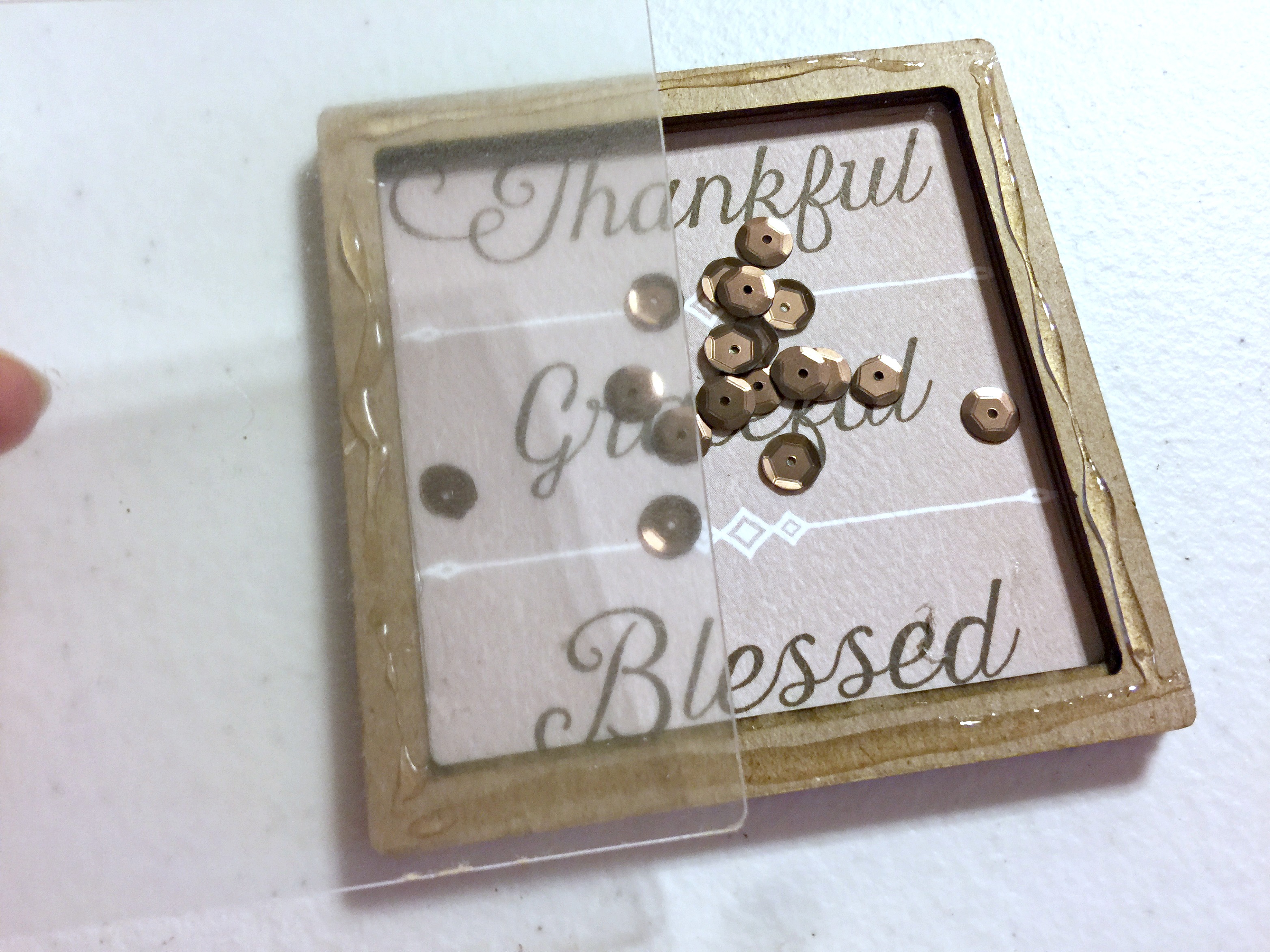 Peel off the clear coat on the acrylic and glue that down sealing in your sequins.