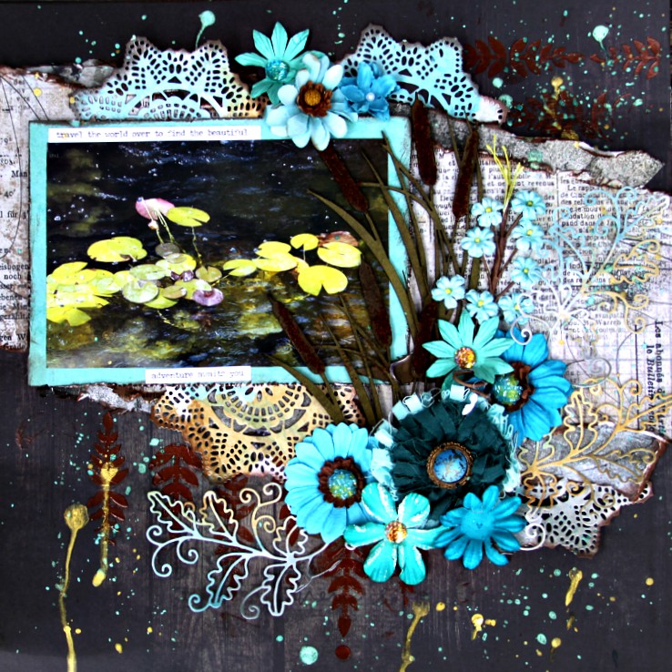 Die cut some doilies and adhere your photo, doilies and Cattails to the layout as shown.