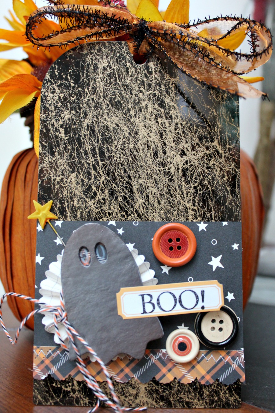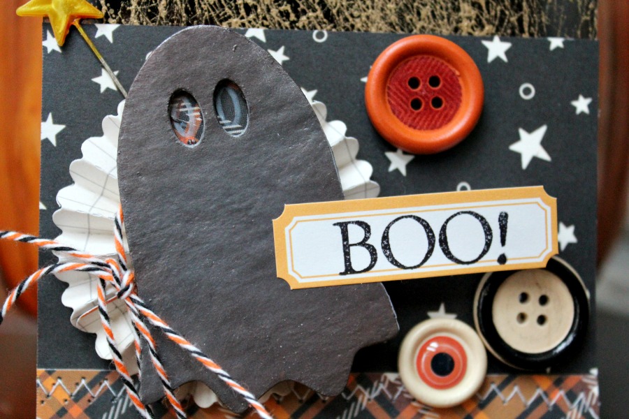 I used a rosette die and bakers twine to set my Chipboard Ghost as well as added a decorative pin and stamped "Boo!". I also added in some orange and black decorative buttons to finish.