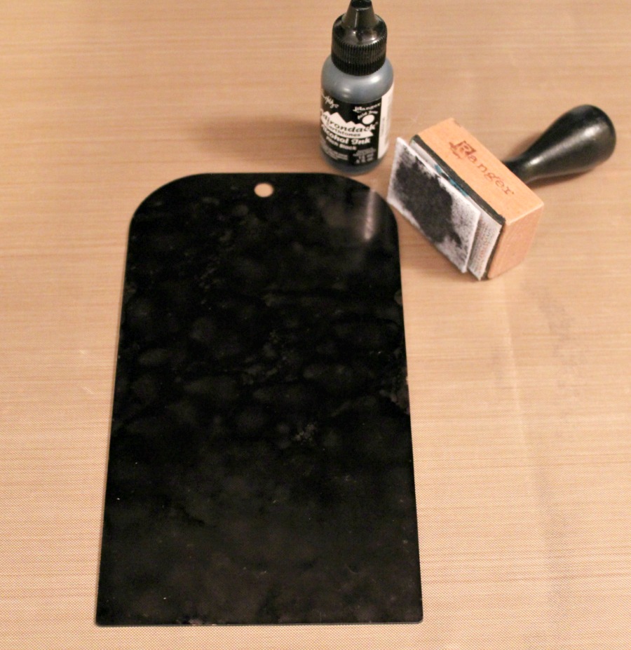 I started with inking my acrylic with Ranger Alcohol Ink in Pitch Black. Alcohol ink is the go-to when it comes to applying color to Clear Scraps acrylic because 1) it is solvent based and the color will "stick" and 2) it dries fast!
