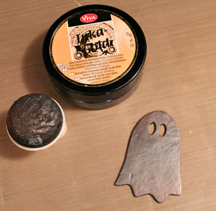 Our fearless leader, Susan, showed me the loveliness that is Inka Gold! Here, I used Inka Gold in Pewter to color my ghost. Inka Gold is like a paste/mousse that is waxed based and can be applied to chipboard or paper. And the more you rub the ink results in extra shimmer! I used a patterned paper to back the eyes in my ghost before adhering him to the front of my tag.