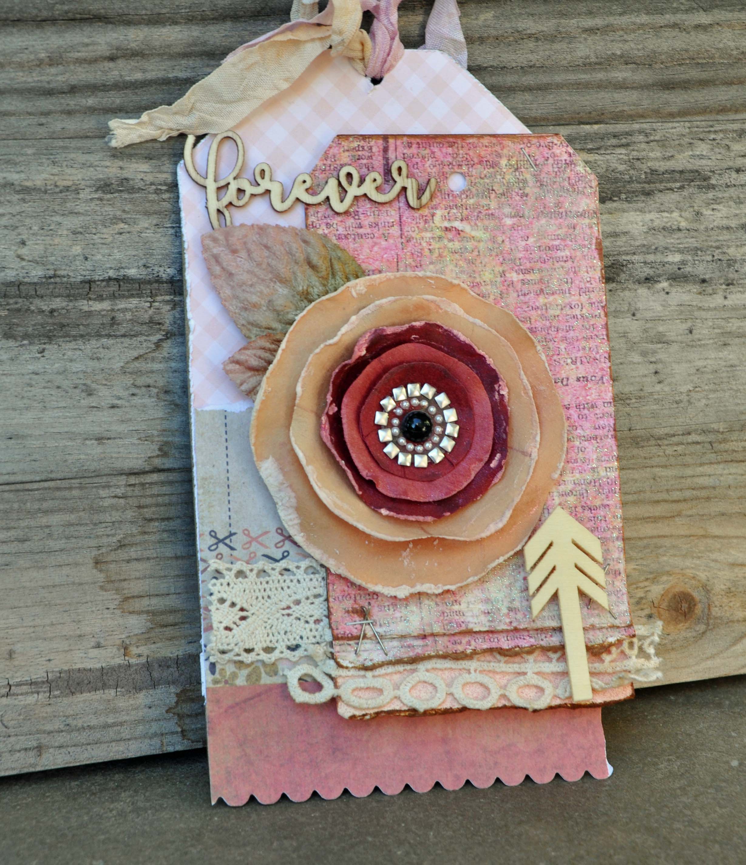 One of my favorite things to do is to layer tags. I began with one of the large chipboard tags from the Chipboard Tag Album. After covering the tag with an assortment of papers and lace, I simply added a patterned paper tag that I had embellished with a flower and some wooden icons.