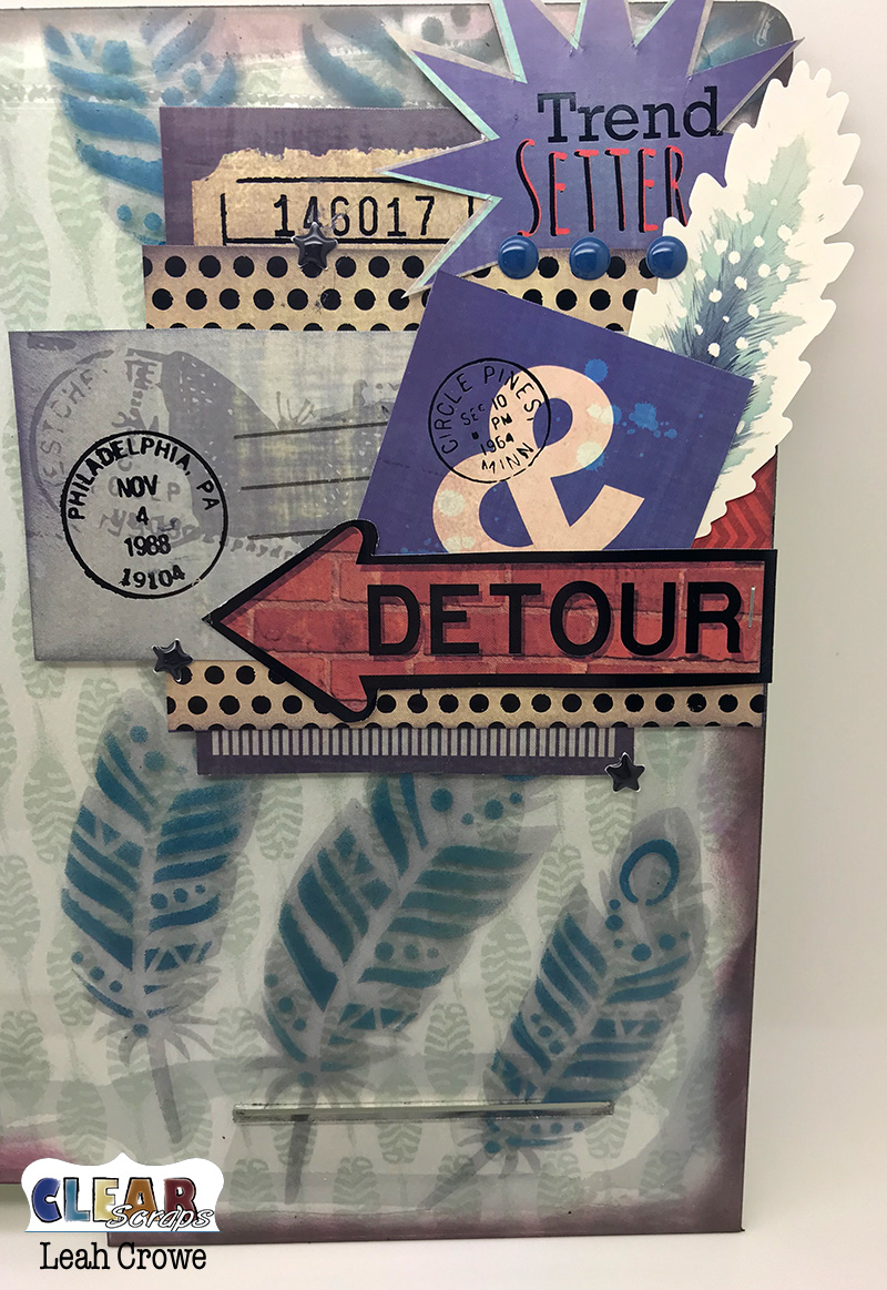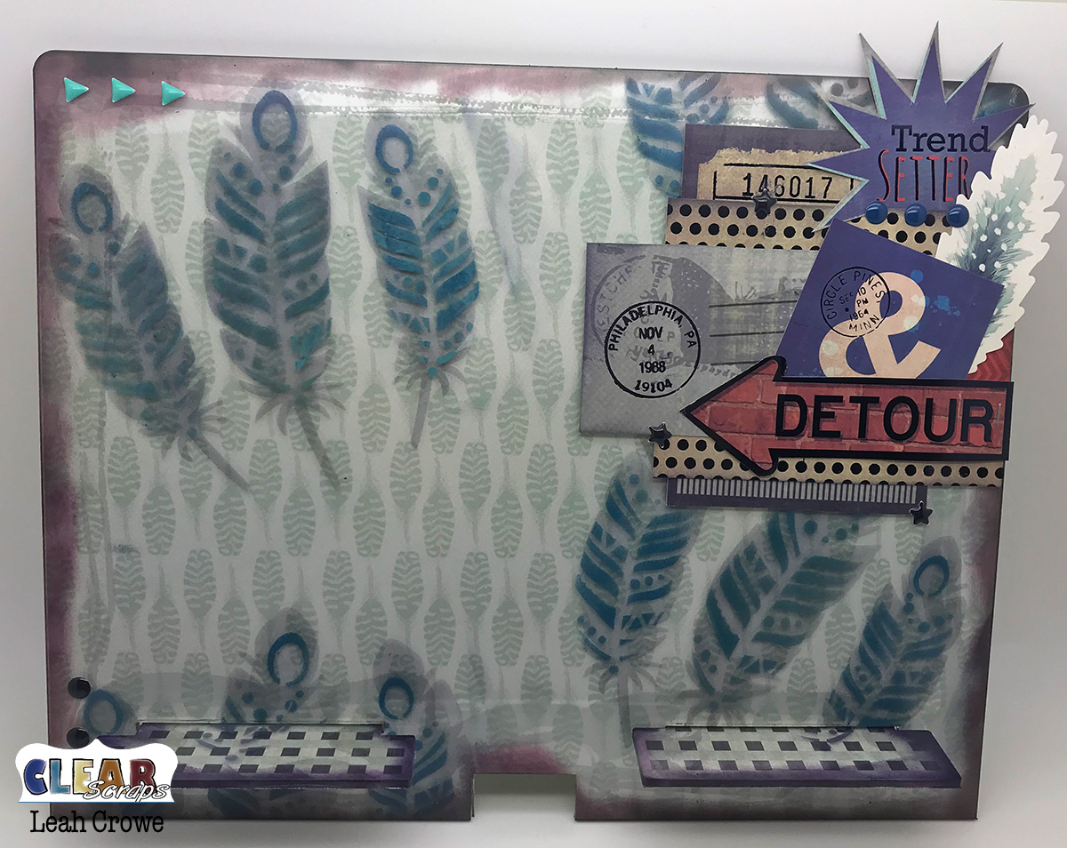 I backed the acrylic with pattern paper, distressed the edges with Stazon ink, and then stenciled the Feather 5×9 layer stencil onto the front of the acrylic.