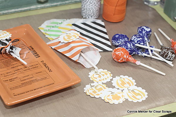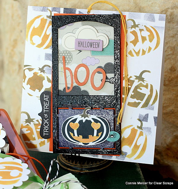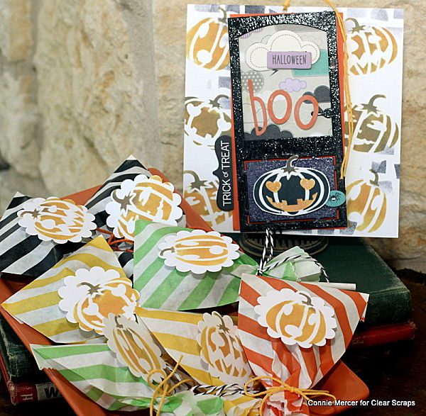 Hi, Connie here with a fun Halloween project using the Jack O Lantern stencil and the Basic Door chipboard piece by Clear Scraps. Candy treat bags and a card were created. The jack o lantern stencil was used for three purposes, the background on the card, the embellishment for the treats and the door jack o lantern. Pretty useful stencil!!!